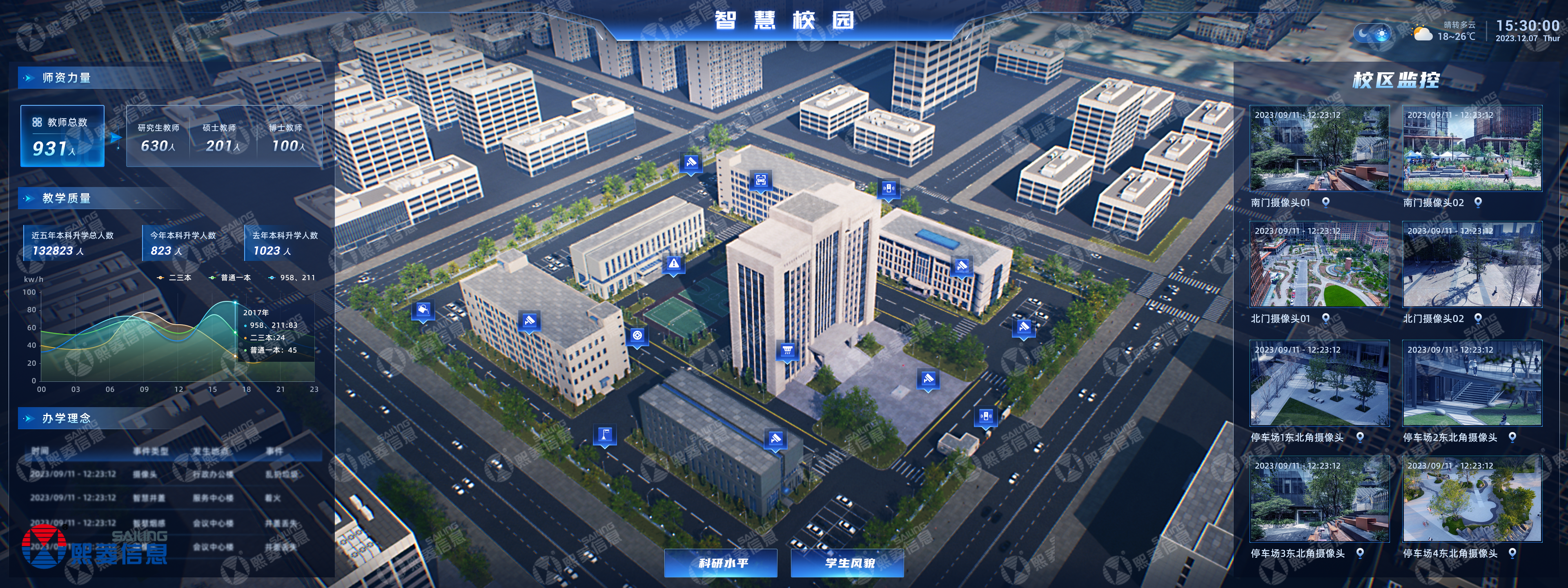 聚焦业务应用,根据当下全国数字新基建实际情况,结合多地政策关于IOC基础应用平台功能建设要点,sungame信息的智慧校园数字孪生综合管理平台主要围绕区域态势、决策分析、应急指挥三模块集成并丰富应用功能。